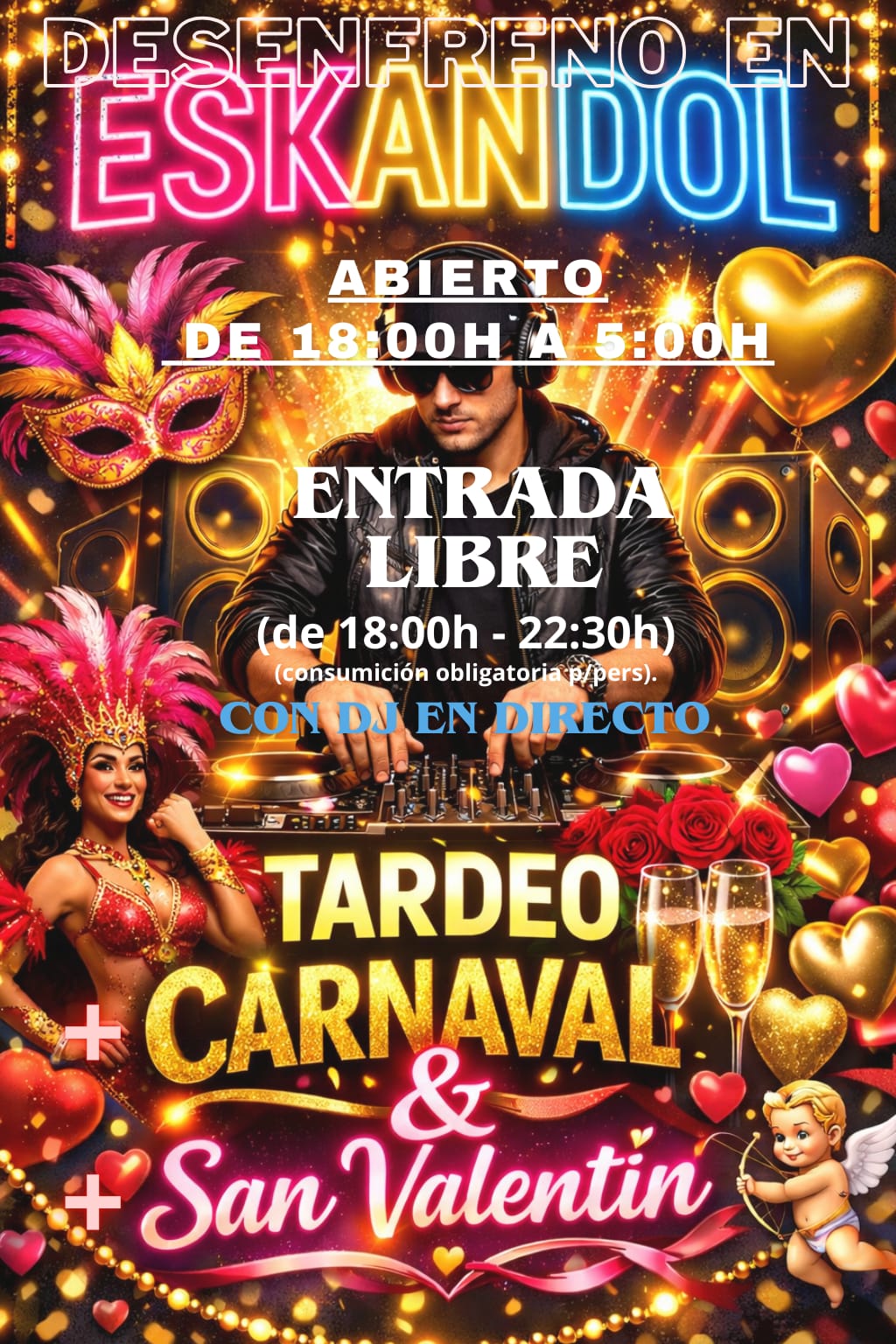 🔥 DESENFRENO EN ESKANDOL 🔥 📅 Sábado 14 de febrero ✨ Primer tardeo del año ✨ 🕕 Abierto de 18:00 h a 05:00 h 🍸 De 18:00 h a 22:30 h ➡️ Entrada libre ➡️ Consumición obligatoria por persona 💃🕺 Cuando cae la noche… 🎭 Celebra CARNAVAL y SAN VALENTÍN con nosotros 💘 Una noche […]