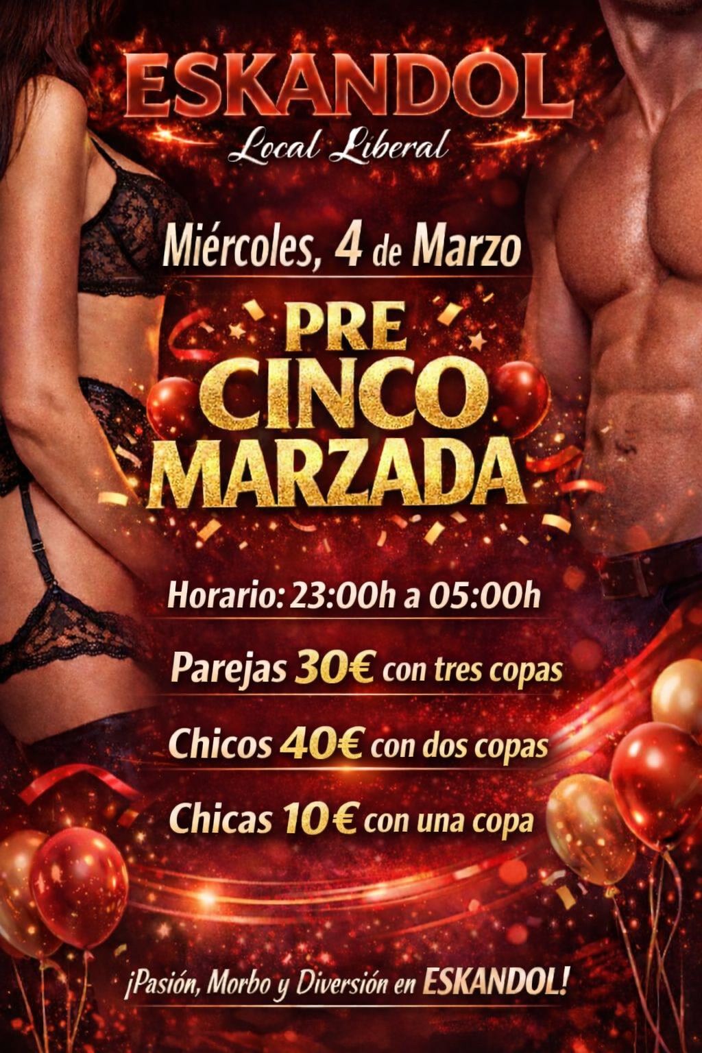🔥 ESKANDOL – Local Liberal 🔥 Este miércoles 4 de marzo ven a vivir la PRE CINCO MARZADA más 🔥 atrevida y divertida… 🕚 Horario: 23:00h a 05:00h 💑 Parejas: 30€ con 3 copas 🍸🍸🍸 👨 Chicos: 40€ con 2 copas 🍹🍹 👩 Chicas: 10€ con 1 copa 🍸 Una noche llena de pasión, morbo […]